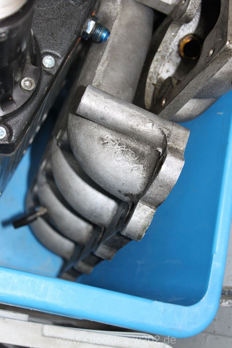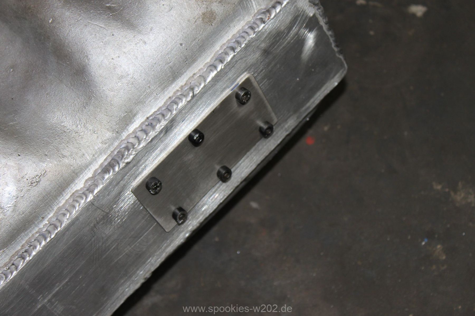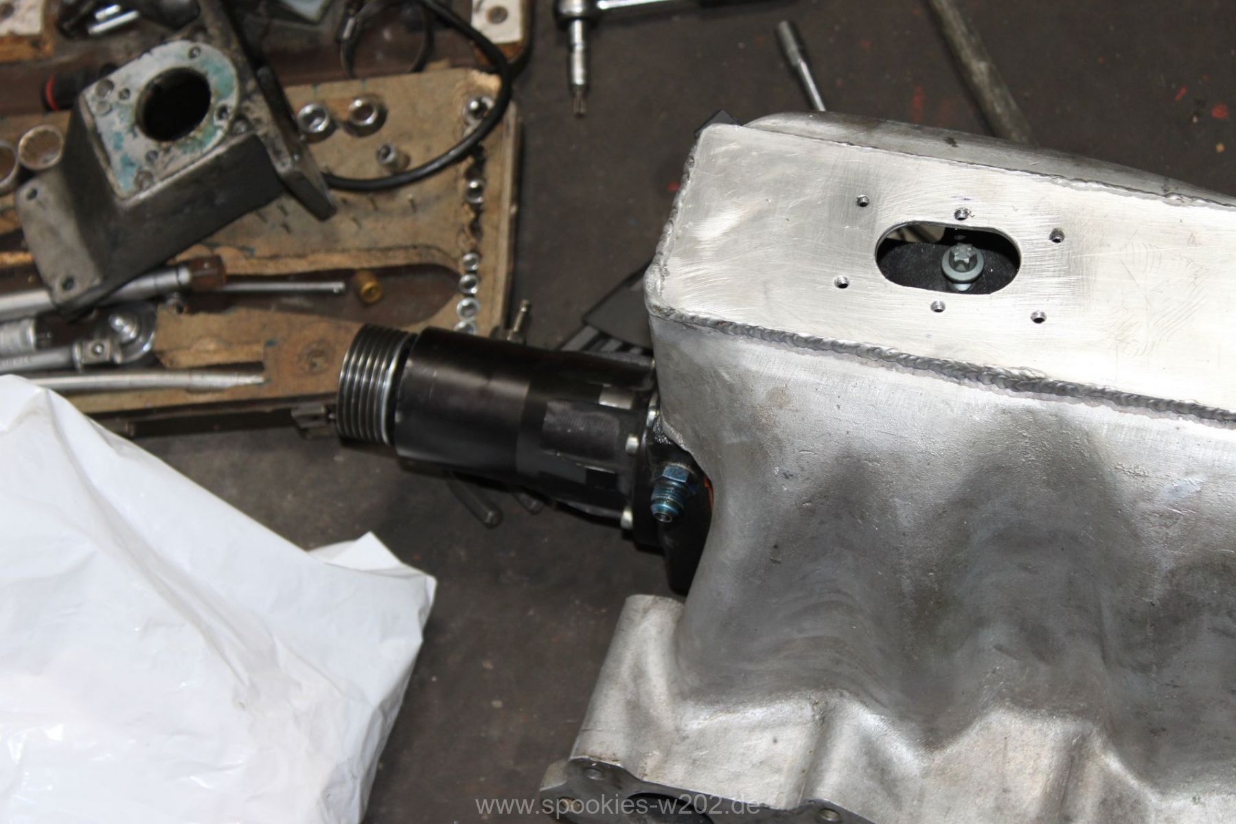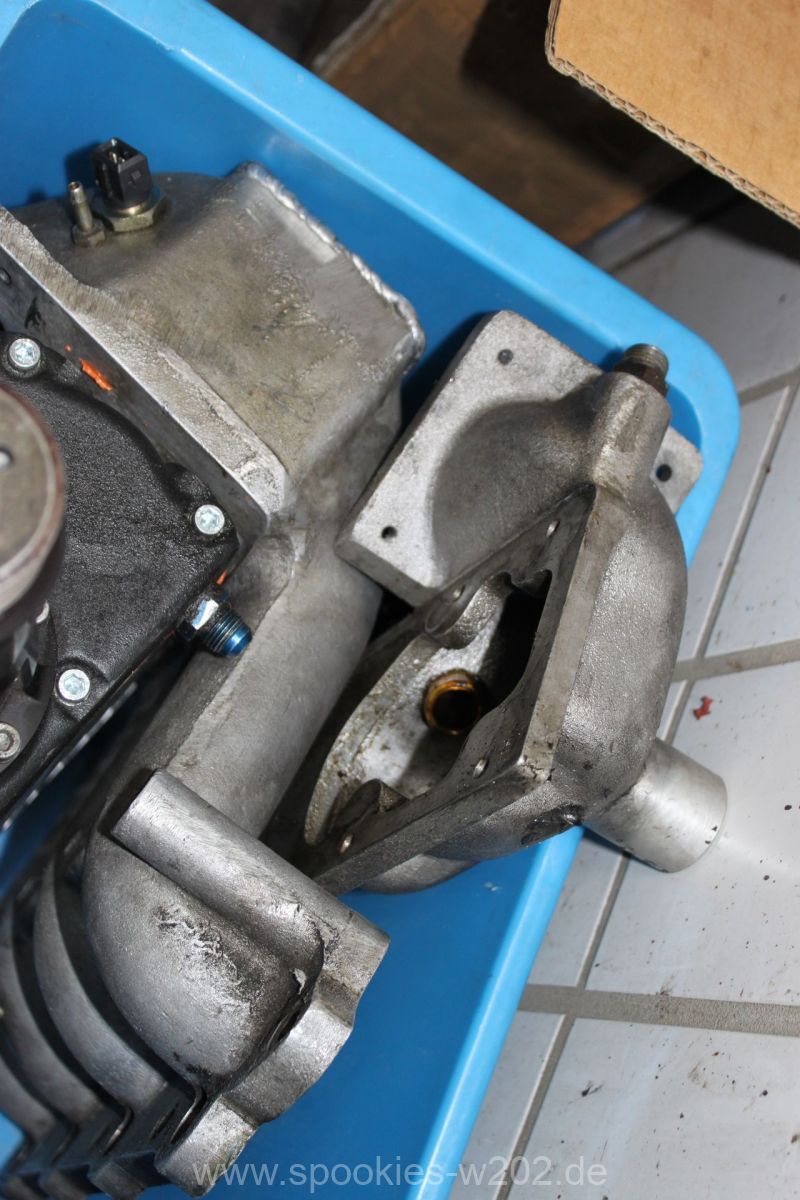 Die Befestigung des Kompressors war auch sehr vermurkst. Ohne Spezialwerkzeug oder verbiegen von Schraubenschlüsseln kam man kaum an die Schrauben dran, wo der Lader auf der Ansaugbrücke festgeschraubt. Hier wurde seitens der Konstrukteure überhaupt nichts gedacht. Im Gegenteil: man entdeckte an der Unterseite der Brücke noch einen zugeschweissten Bereich, hier hätte eigentlich eine Art Ladeluftkühler eingebaut gehört, aber der Raum ist nun freigelassen. Ich kann mich an den Anfang des Umbaus erinnern, wo so ein Kühler mit im Paket war, dieser wurde aber nie verbaut. Ob das nun Sinn macht, einen passenden wieder zu besorgen oder ob man es einfach sein lässt und irgendwann einen externen nimmt, ist keine großte Frage. Den packe ich dann lieber nach vorne, wo er mehr Luft bekommt und die zugeschweisste Platte bleibt so sie ist. Markus hat sich nun eine andere Befestigung ausgedacht, wo man im Notfall auch noch rankommt. Auf einem Bild sieht man eine kleine Platte, die er reingeschnitten und wieder zugemacht hat. Darüber kommt man nun an die Befestigungen des Laders heran.