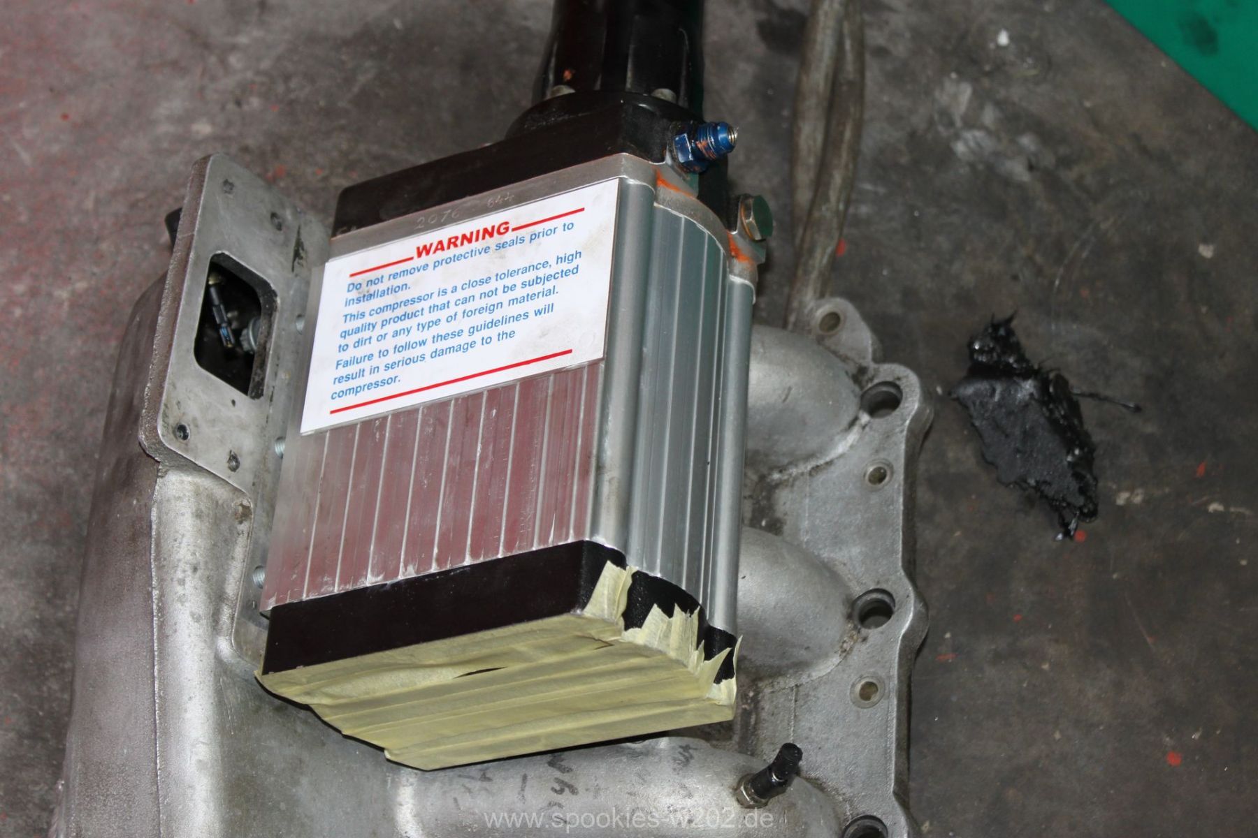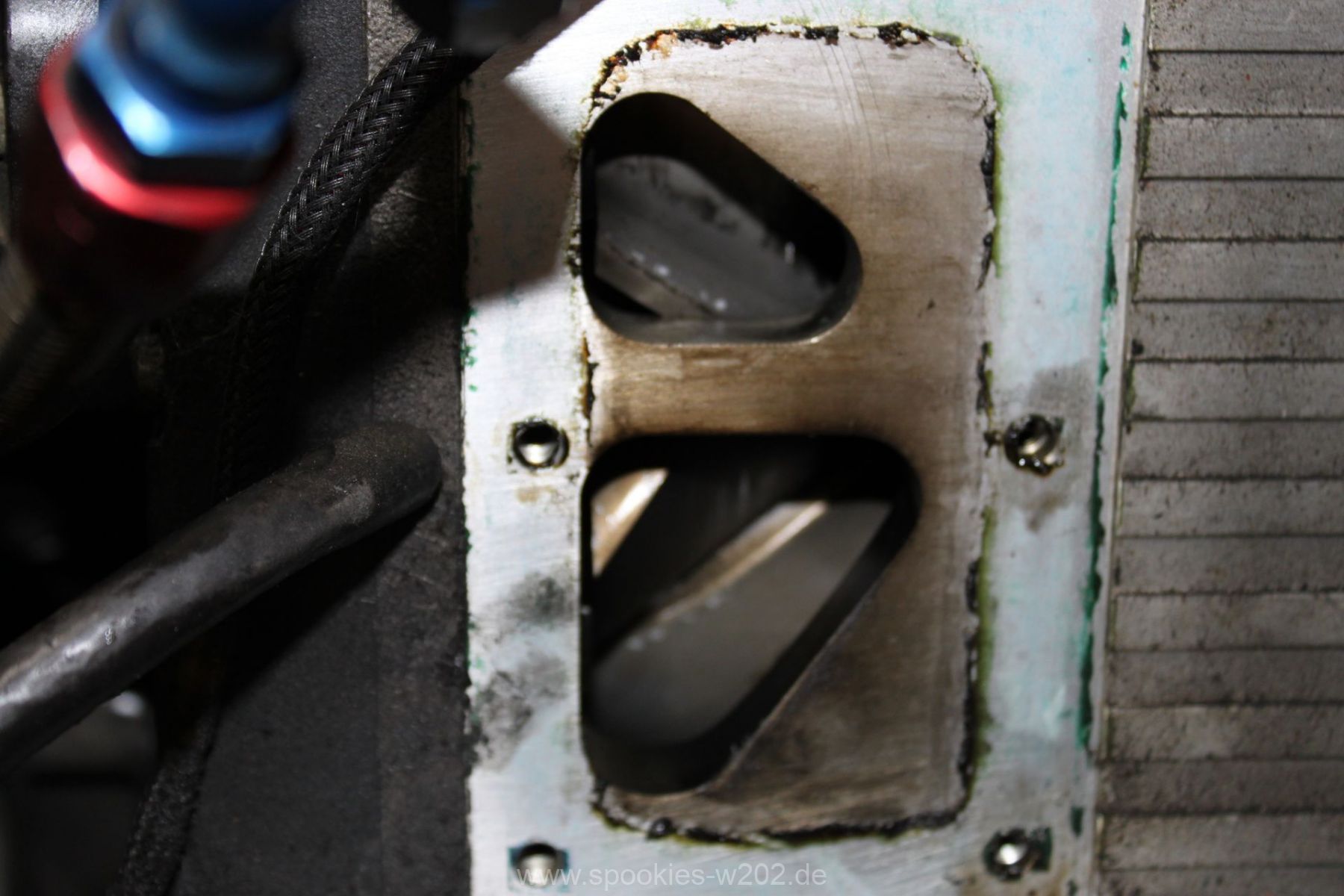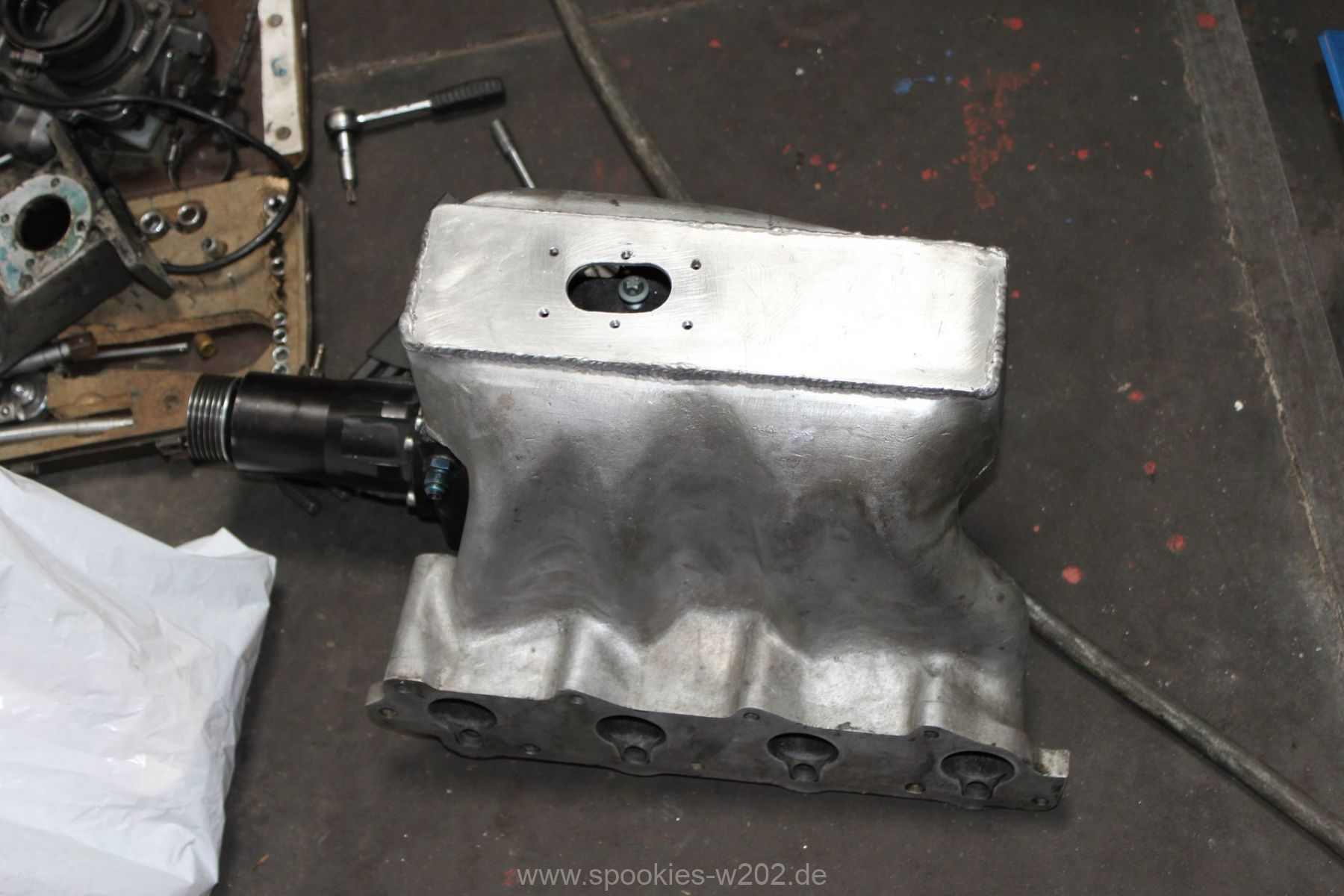 Die Befestigung des Kompressors war auch sehr vermurkst. Ohne Spezialwerkzeug oder verbiegen von Schraubenschlüsseln kam man kaum an die Schrauben dran, wo der Lader auf der Ansaugbrücke festgeschraubt. Hier wurde seitens der Konstrukteure überhaupt nichts gedacht. Im Gegenteil: man entdeckte an der Unterseite der Brücke noch einen zugeschweissten Bereich, hier hätte eigentlich eine Art Ladeluftkühler eingebaut gehört, aber der Raum ist nun freigelassen. Ich kann mich an den Anfang des Umbaus erinnern, wo so ein Kühler mit im Paket war, dieser wurde aber nie verbaut. Ob das nun Sinn macht, einen passenden wieder zu besorgen oder ob man es einfach sein lässt und irgendwann einen externen nimmt, ist keine großte Frage. Den packe ich dann lieber nach vorne, wo er mehr Luft bekommt und die zugeschweisste Platte bleibt so sie ist. Markus hat sich nun eine andere Befestigung ausgedacht, wo man im Notfall auch noch rankommt. Auf einem Bild sieht man eine kleine Platte, die er reingeschnitten und wieder zugemacht hat. Darüber kommt man nun an die Befestigungen des Laders heran.
