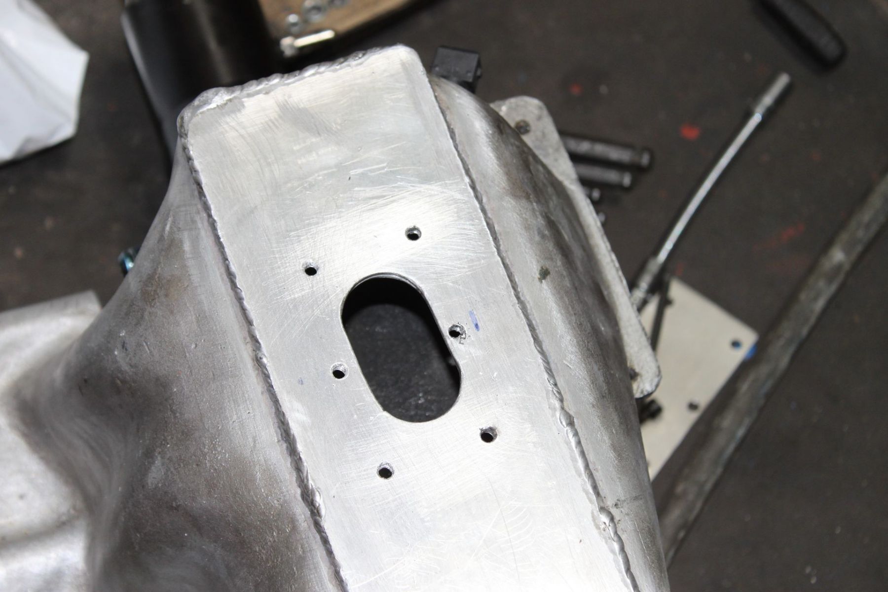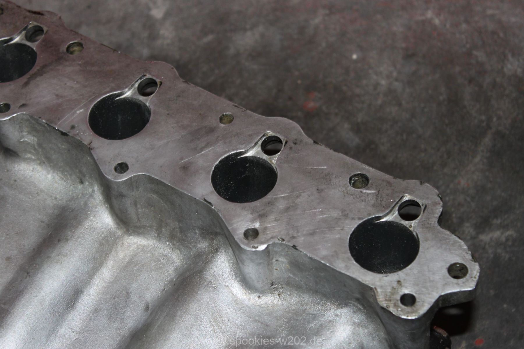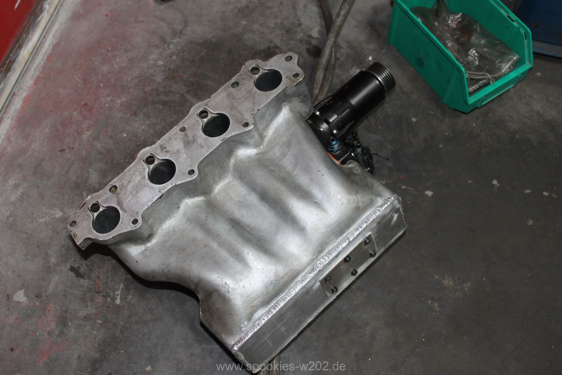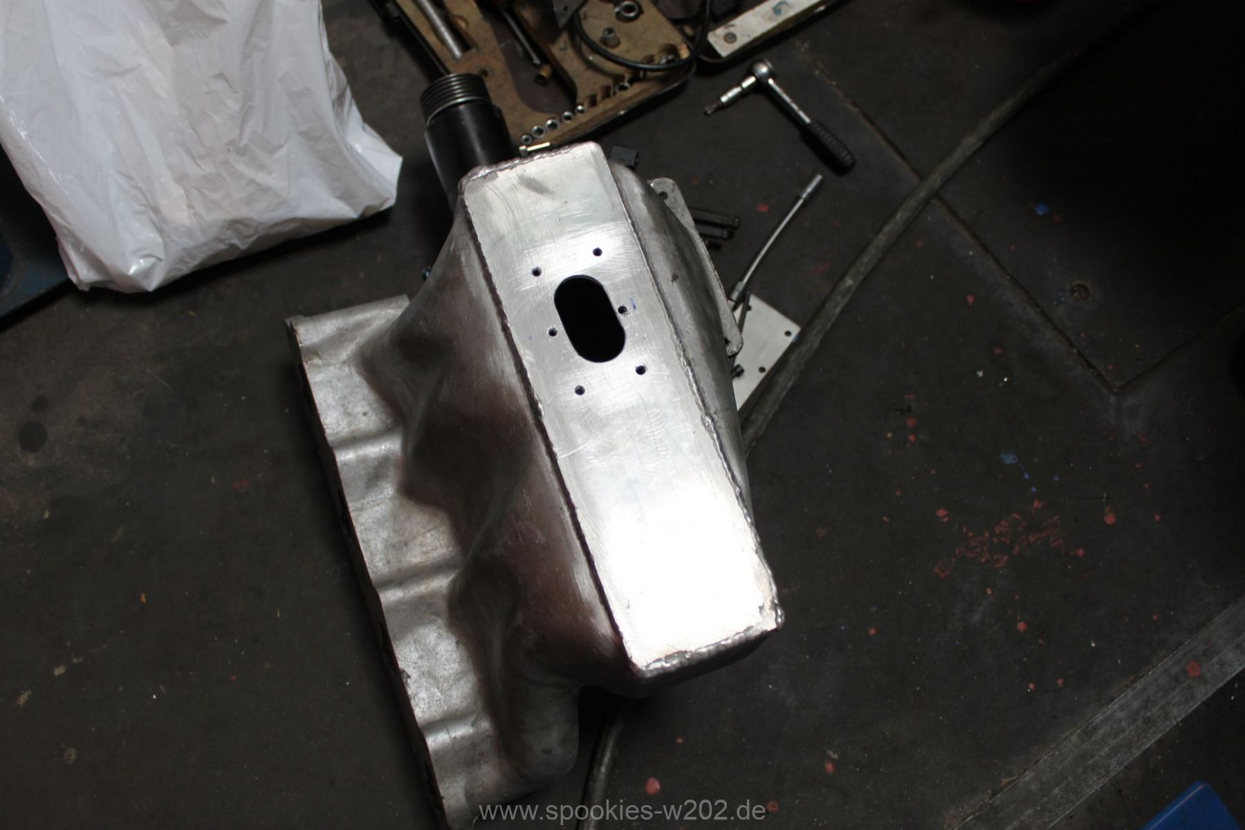 Die Befestigung des Kompressors war auch sehr vermurkst. Ohne Spezialwerkzeug oder verbiegen von Schraubenschlüsseln kam man kaum an die Schrauben dran, wo der Lader auf der Ansaugbrücke festgeschraubt. Hier wurde seitens der Konstrukteure überhaupt nichts gedacht. Im Gegenteil: man entdeckte an der Unterseite der Brücke noch einen zugeschweissten Bereich, hier hätte eigentlich eine Art Ladeluftkühler eingebaut gehört, aber der Raum ist nun freigelassen. Ich kann mich an den Anfang des Umbaus erinnern, wo so ein Kühler mit im Paket war, dieser wurde aber nie verbaut. Ob das nun Sinn macht, einen passenden wieder zu besorgen oder ob man es einfach sein lässt und irgendwann einen externen nimmt, ist keine großte Frage. Den packe ich dann lieber nach vorne, wo er mehr Luft bekommt und die zugeschweisste Platte bleibt so sie ist. Markus hat sich nun eine andere Befestigung ausgedacht, wo man im Notfall auch noch rankommt. Auf einem Bild sieht man eine kleine Platte, die er reingeschnitten und wieder zugemacht hat. Darüber kommt man nun an die Befestigungen des Laders heran.