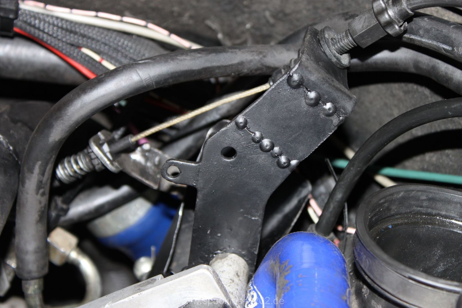Das wurde hier nun richtig gemacht. Markus hat den Halter für den Zug verändert im Winkel und so gesetzt, dass der Gaszug nun endlich wieder richtig sitzt und vor allem frei laufen kann. Es sieht auf den Bildern zwar eng aus, aber das ist nicht so. Freier Lauf, ohne Probleme. Es wurde hierzu auch noch eine Benzinleitung, die wo im Weg war, rausgenommen und durch eine etwas längere ersetzt. So kann man nun die Leitung etwas anders legen und hat für den Zug mehr Platz. Das ist auch so eine halb durchdachte Konstruktion seitens der Umbaufirma gewesen, wo man sich fragt, warum die das nicht gleich richtig gemacht haben. Ich kann mich an mehrere Telefonate erinnern, wo sie an dem Zug rumgespielt haben, damit es besser läuft, aber optimal war es nie. Im Gegenteil: ich hatte bei der Abholung des Fahrzeugs damals nichtmal einen Kickdown – das geht ja mal gar nicht.