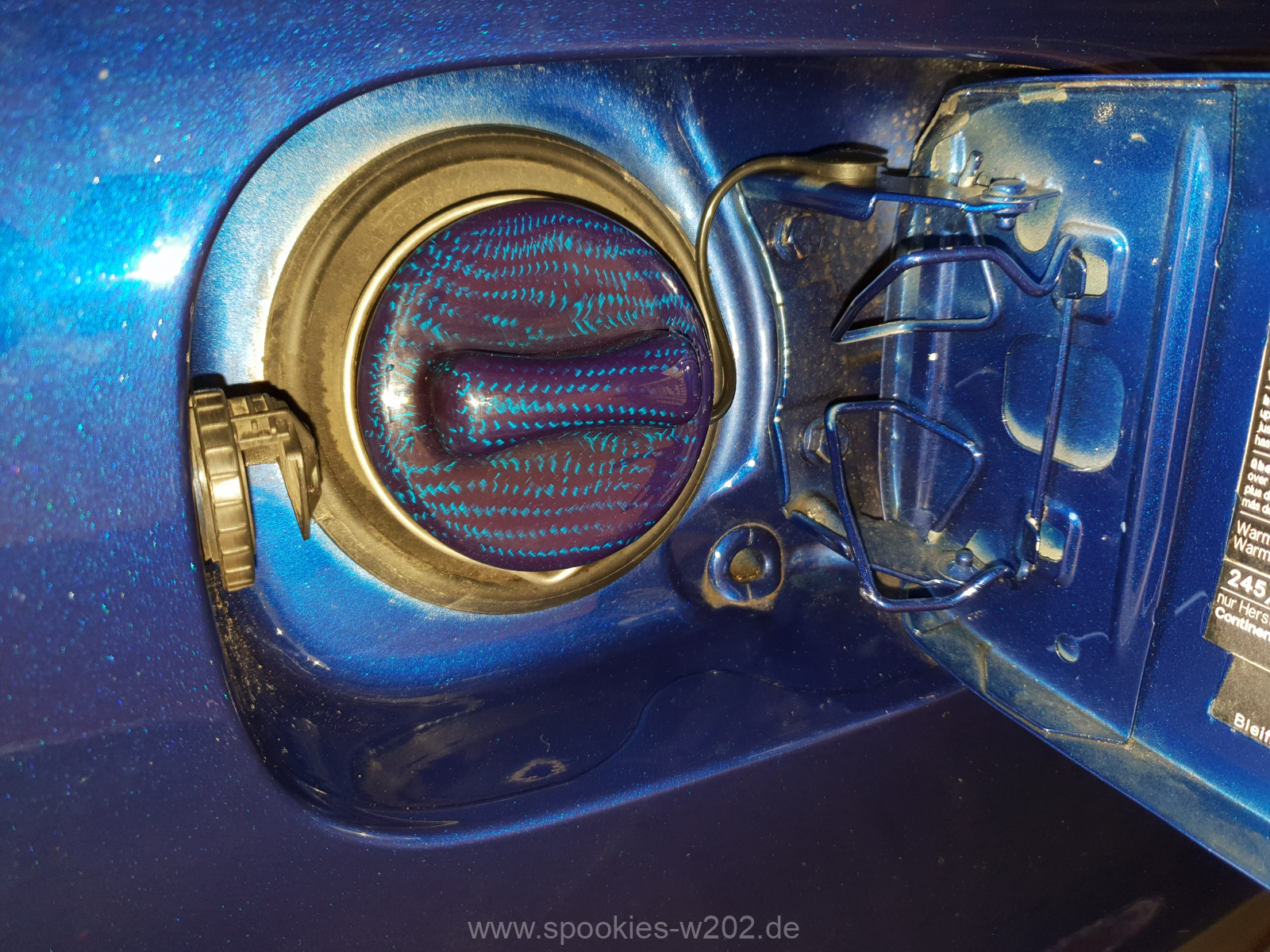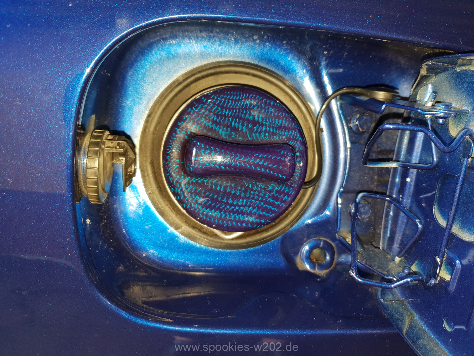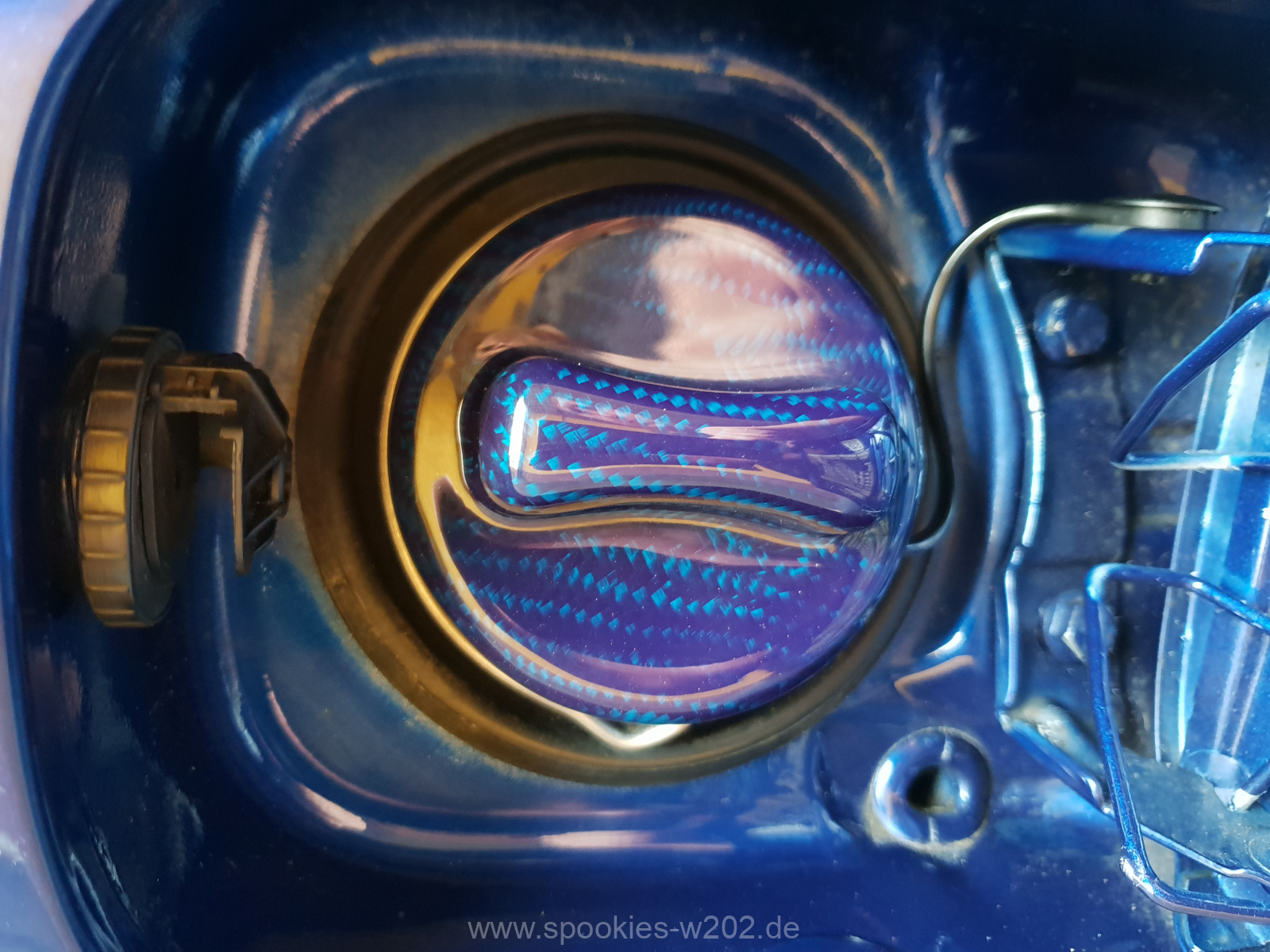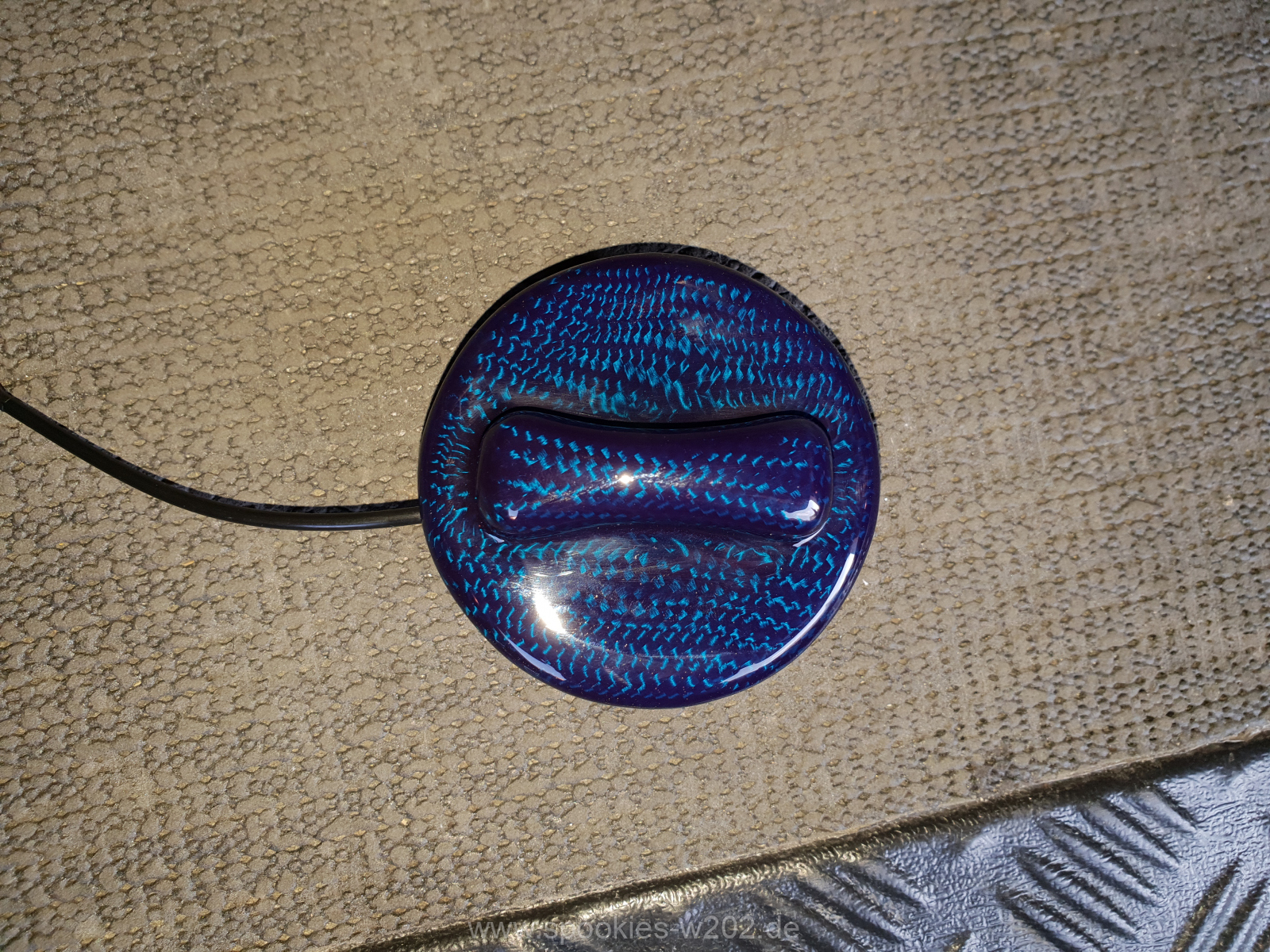 Zugegeben: man muss schon etwas irre veranlagt sein, dass man auf solche Ideen kommt. Aber da die Halteleine meines alten Tankdeckels ohnehin gerissen war und ein neuer kommen sollte, kam man auf die verrückte Idee: warum nicht auch wie beim W203 hier mit Carbonfasern belegen und veredeln. Nur dass man hier nicht das schwarze gelassen hat, sondern noch brilliantblau mit ins Spiel kam. Das Ergebnis ist etwas besonderes, was wiedermal keiner hat oder keiner Wert drauf legt.