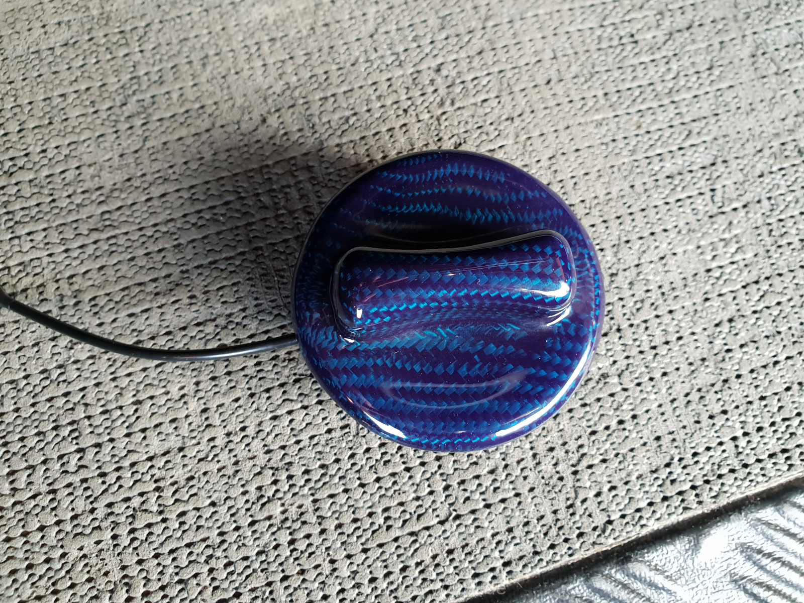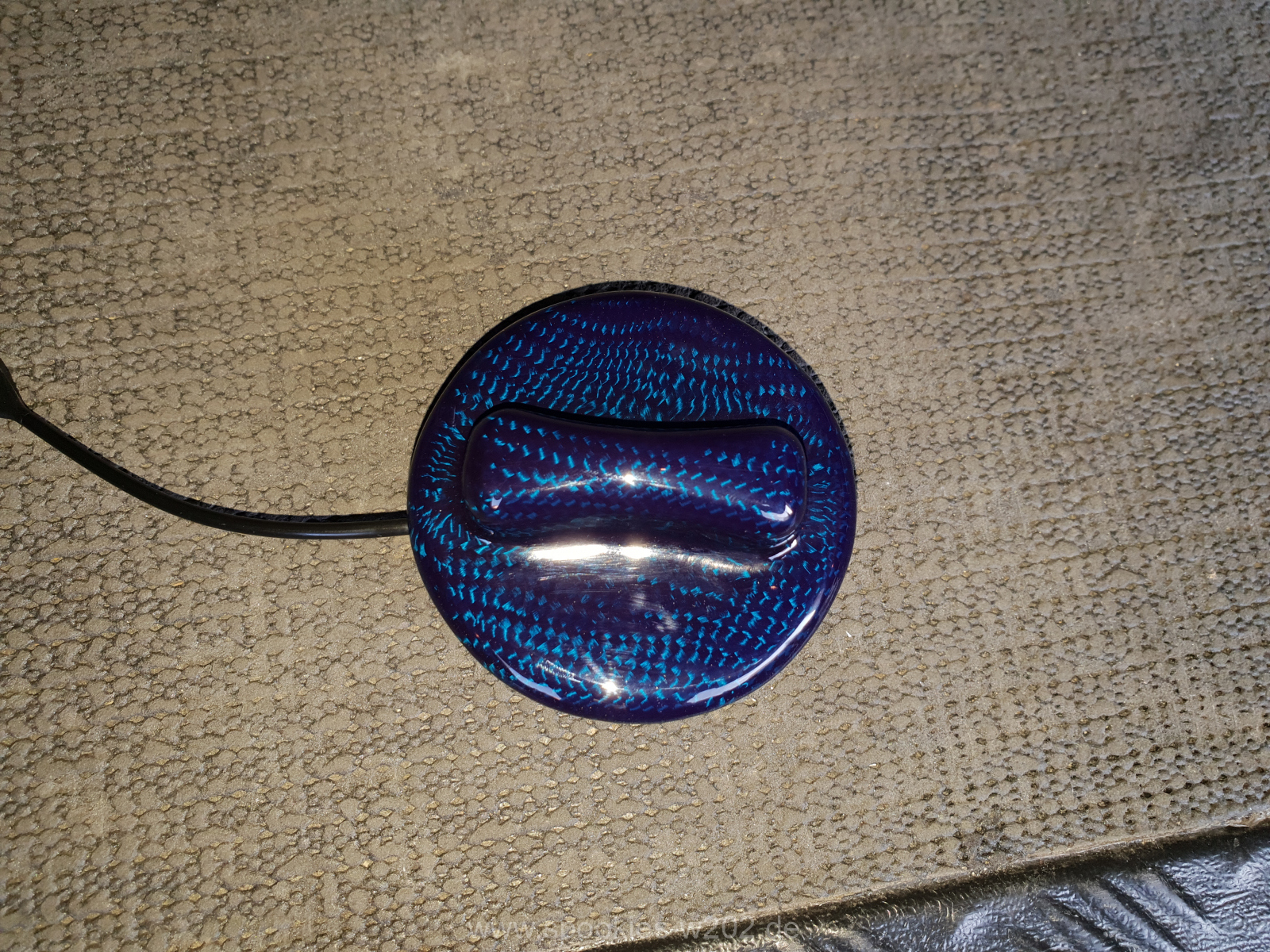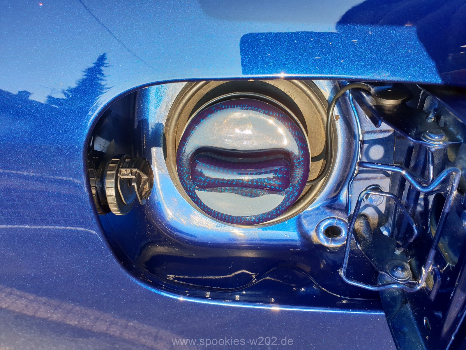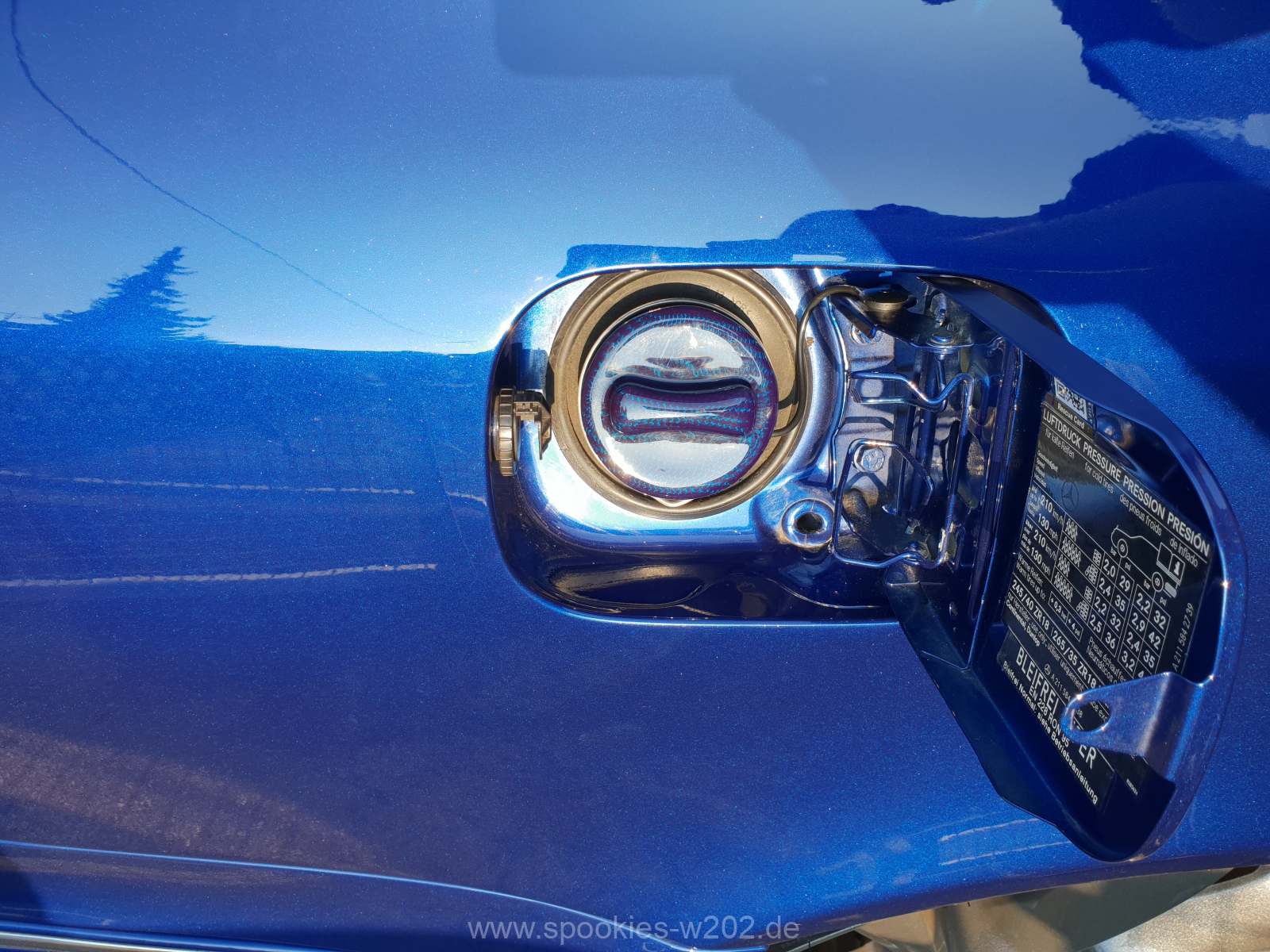 Zugegeben: man muss schon etwas irre veranlagt sein, dass man auf solche Ideen kommt. Aber da die Halteleine meines alten Tankdeckels ohnehin gerissen war und ein neuer kommen sollte, kam man auf die verrückte Idee: warum nicht auch wie beim W203 hier mit Carbonfasern belegen und veredeln. Nur dass man hier nicht das schwarze gelassen hat, sondern noch brilliantblau mit ins Spiel kam. Das Ergebnis ist etwas besonderes, was wiedermal keiner hat oder keiner Wert drauf legt.
