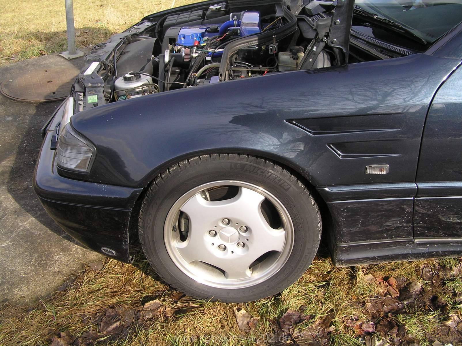 Zugegeben: die Fotos sind merkwürdig in diesem Industriegebiet. Ich wollte aber auf der Durchfahrt unbeingt kurz neue Fotos vom Zustand machen, nachdem mal wieder umgebaut wurde. Unter der Haube ging es weiter mit dem Kompressorumbau, zudem gab es die Haube mit den Powerdomes vom SLK, die NTC Koflügel mit Öffnungen und lackierte Einzelteile. Unschöne Gegend aber interessante Details.
