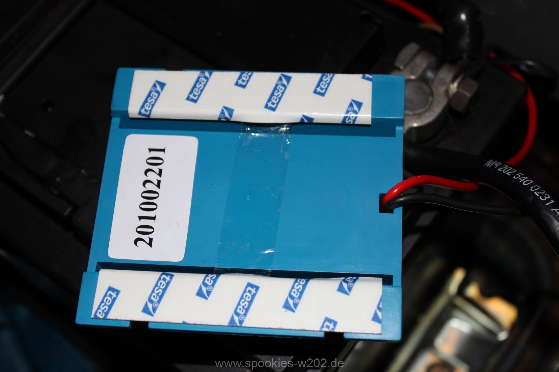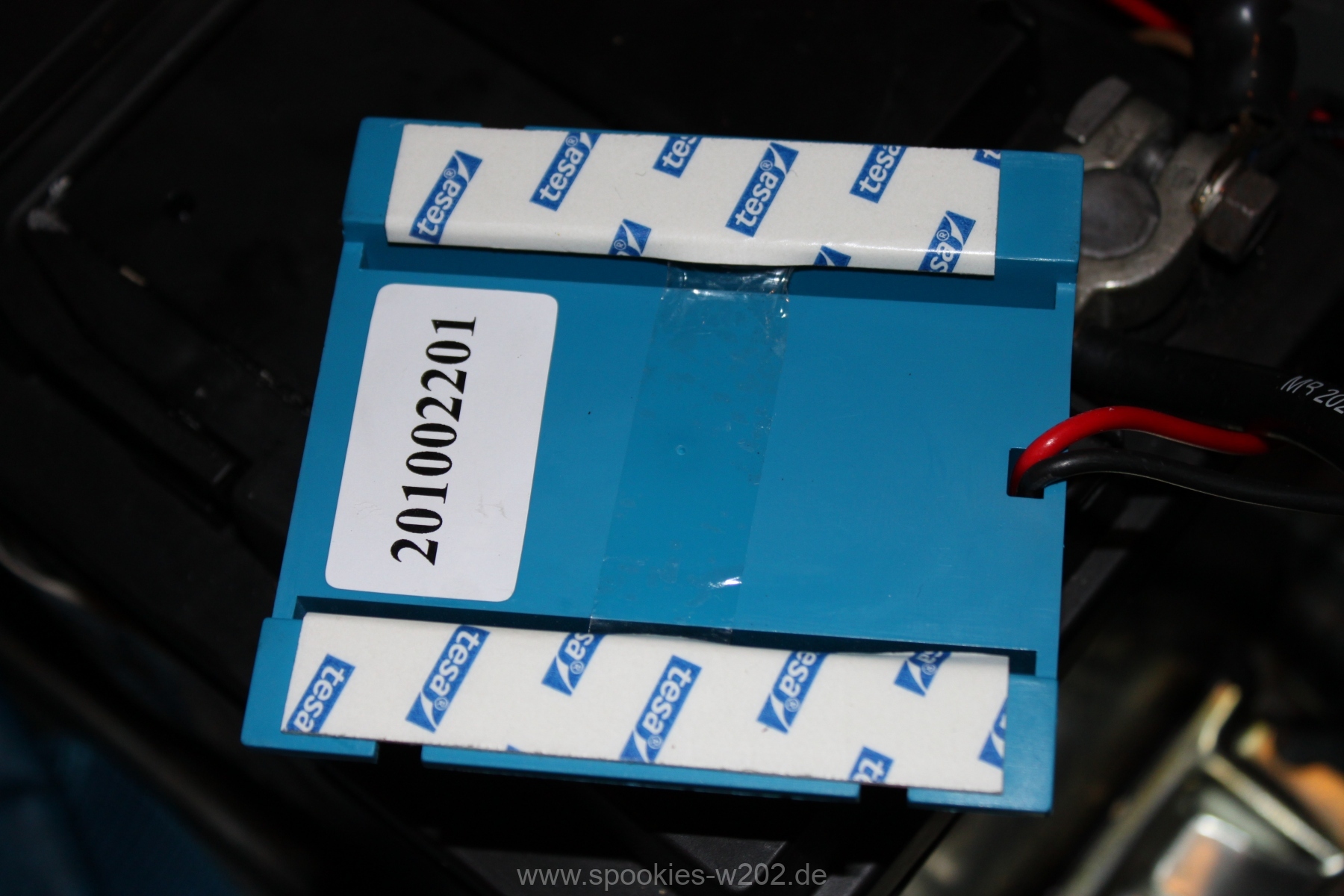 Die Montage ist kindereinfach: Es ist entweder ein doppelseitiges Klettband dabei oder aber man nimmt einfach normales doppelseitiges Klebeband wie ich in dem Fall, da das Klettband fehlte in der Verpackung. Zuerst dachte ich, man könnte es an das Blech neben der Batterie kleben, hält aber nicht sehr lange, also klebte ich es nun doch noch direkt an die Batterie, so wird auch der Kabelweg kurz gehalten.
