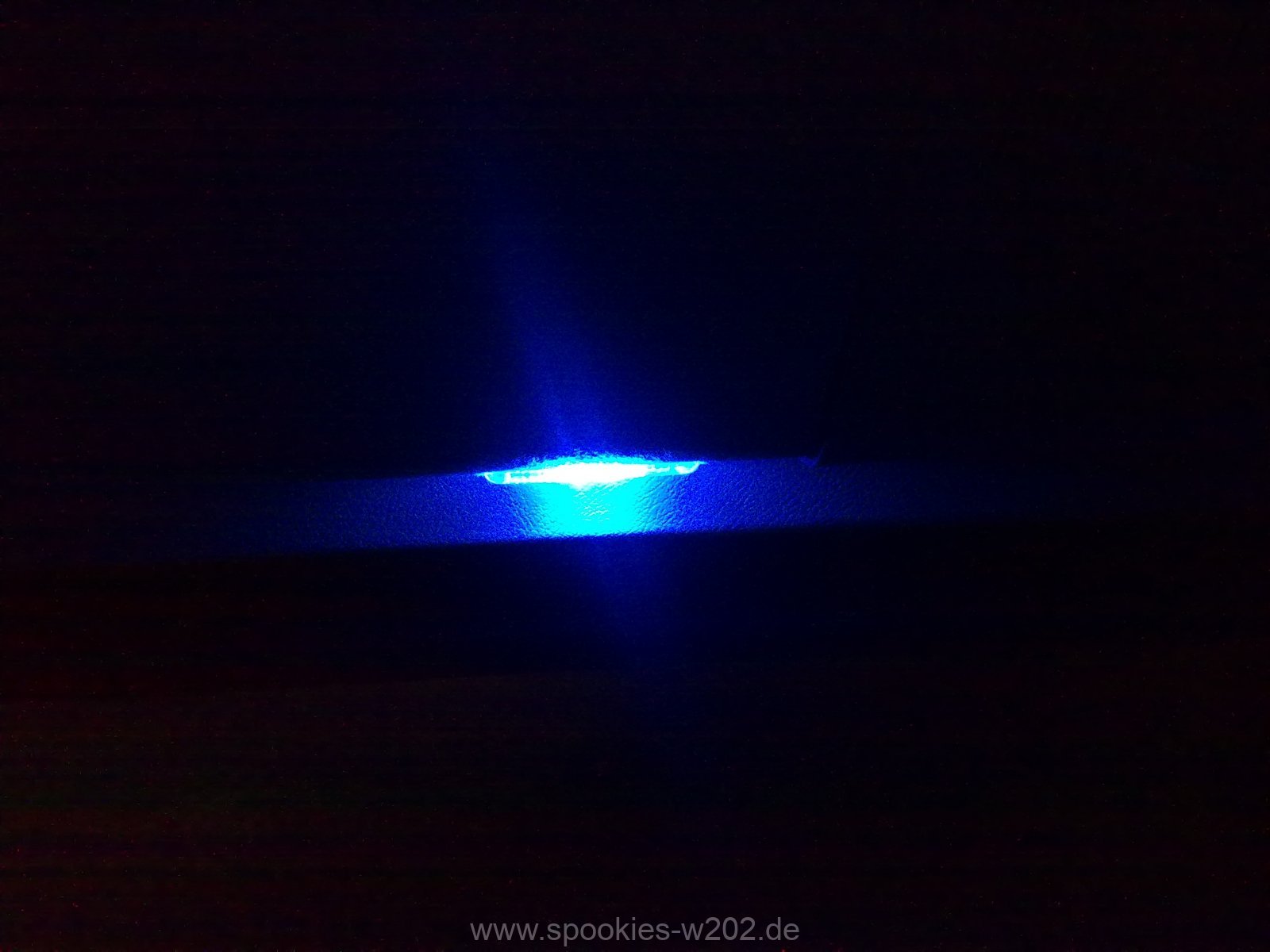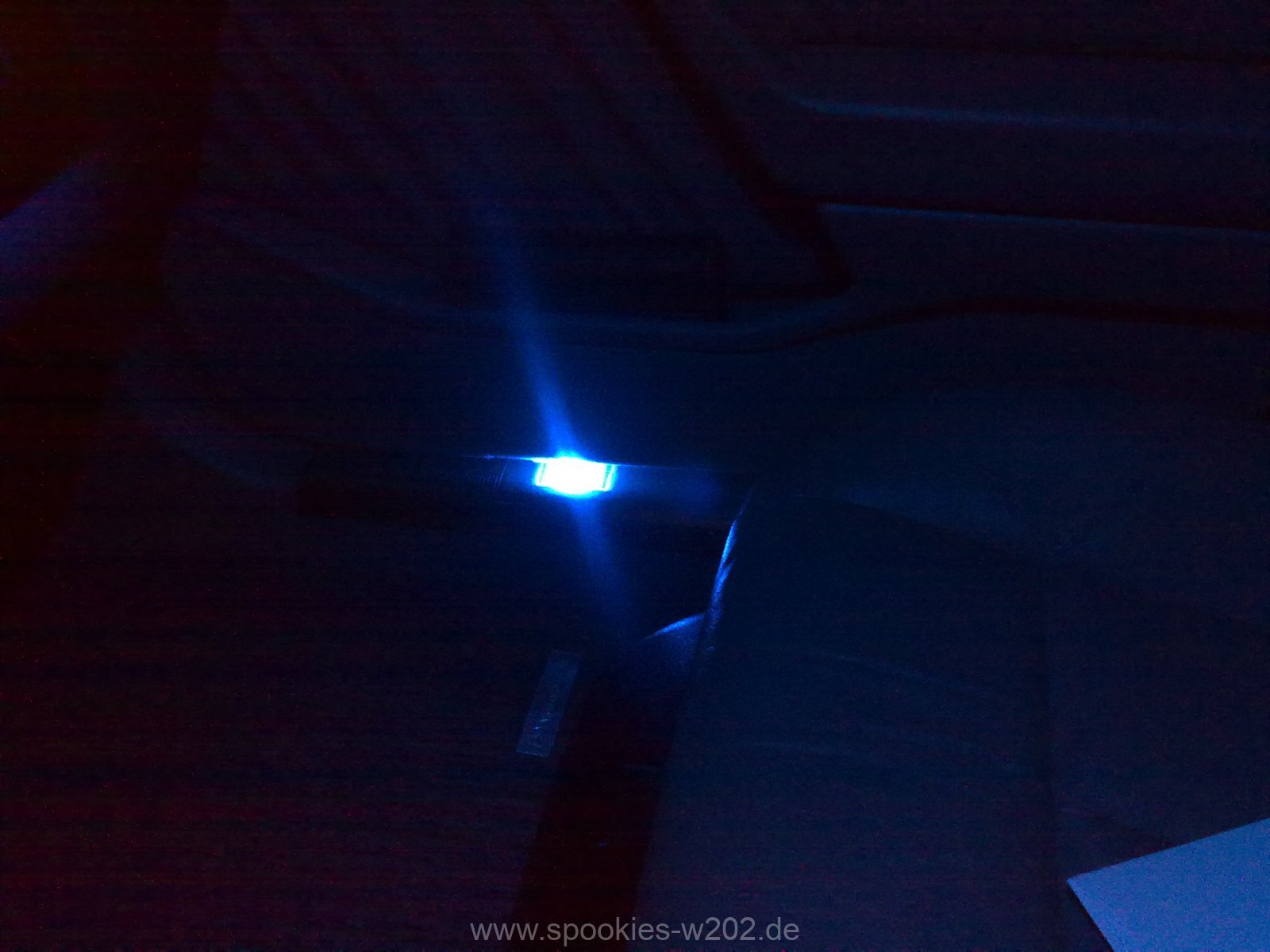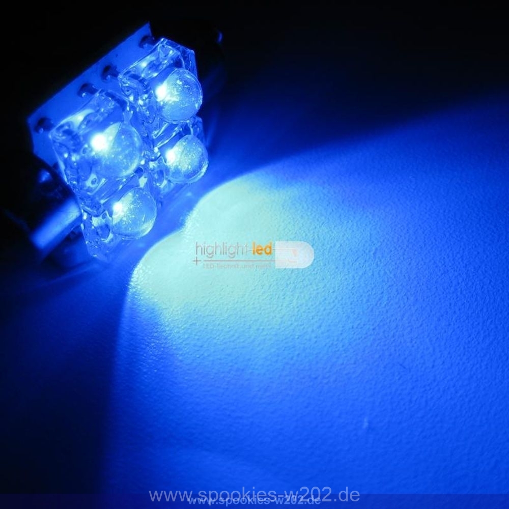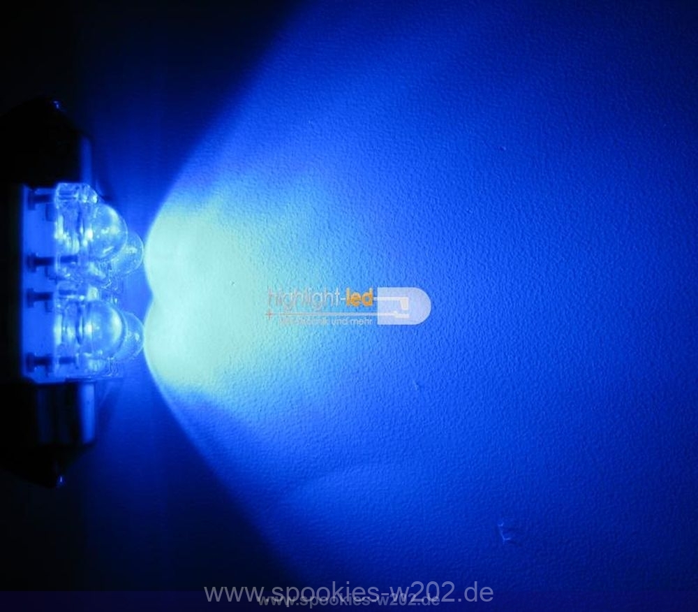 Weisse Beleuchtung passt dann noch nicht so wirklich zu meinem Wagen, der Meinung war auch meine Freundin. Innenraum blau, Einstiegsleisten blau, da fällt dieser weisse Schein sehr negativ auf. Also habe ich kurzerhand blaue Superflux LED Sofitten bei ebay bestellt mit jeweils 4 LEDs, da in der grösse nicht mehr passen und diese kurzerhand gegen die weissen Sofitten ausgetauscht und was soll ich sagen: der Effekt ist klasse. Diese sind ebenfalls sehr hell und strahlen gut auf den Boden, so wirkt das wieder einheitlich schön.