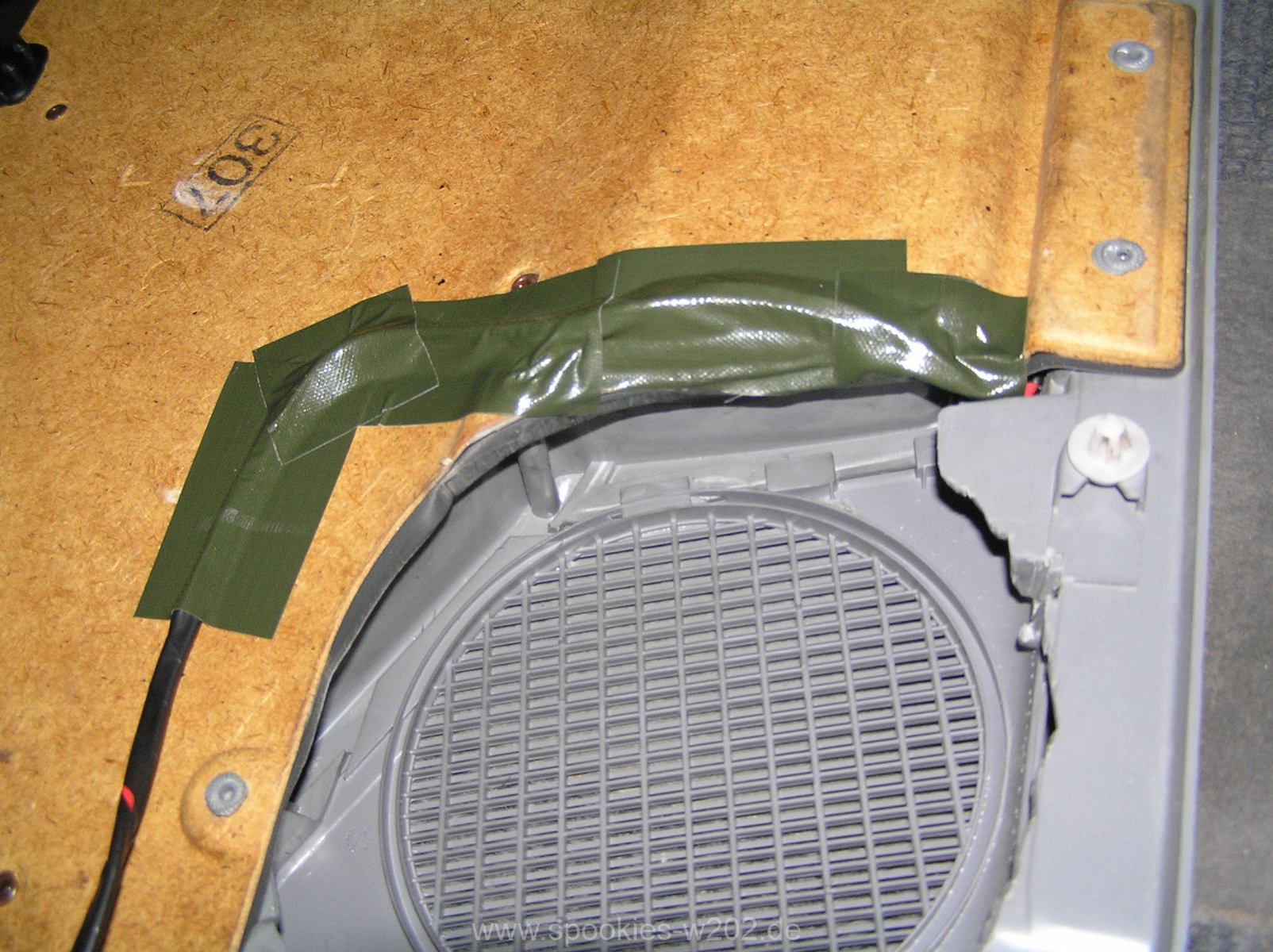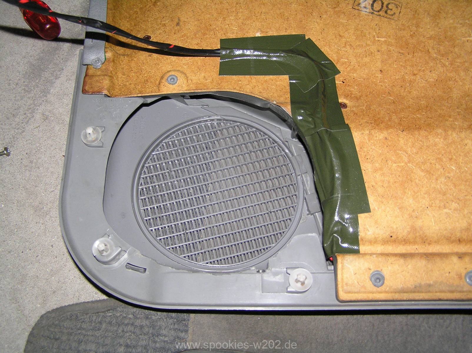Ich bin nun hergegangen und habe die Kabel alle sauber zusammengewickelt, damit keine Reibung entstehen kann und diese am Lautsprechergitter entlang geführt und vorsichtshalber mit Tape befestigt, denn auch Kabel können bei gewissen Bässen in der Türe anfangen zu scheppern und das gilt es zu vermeiden. Das ganze ist nicht schön, aber praktisch und schnell gemacht. Man sieht die Innenseite sowieso nie.