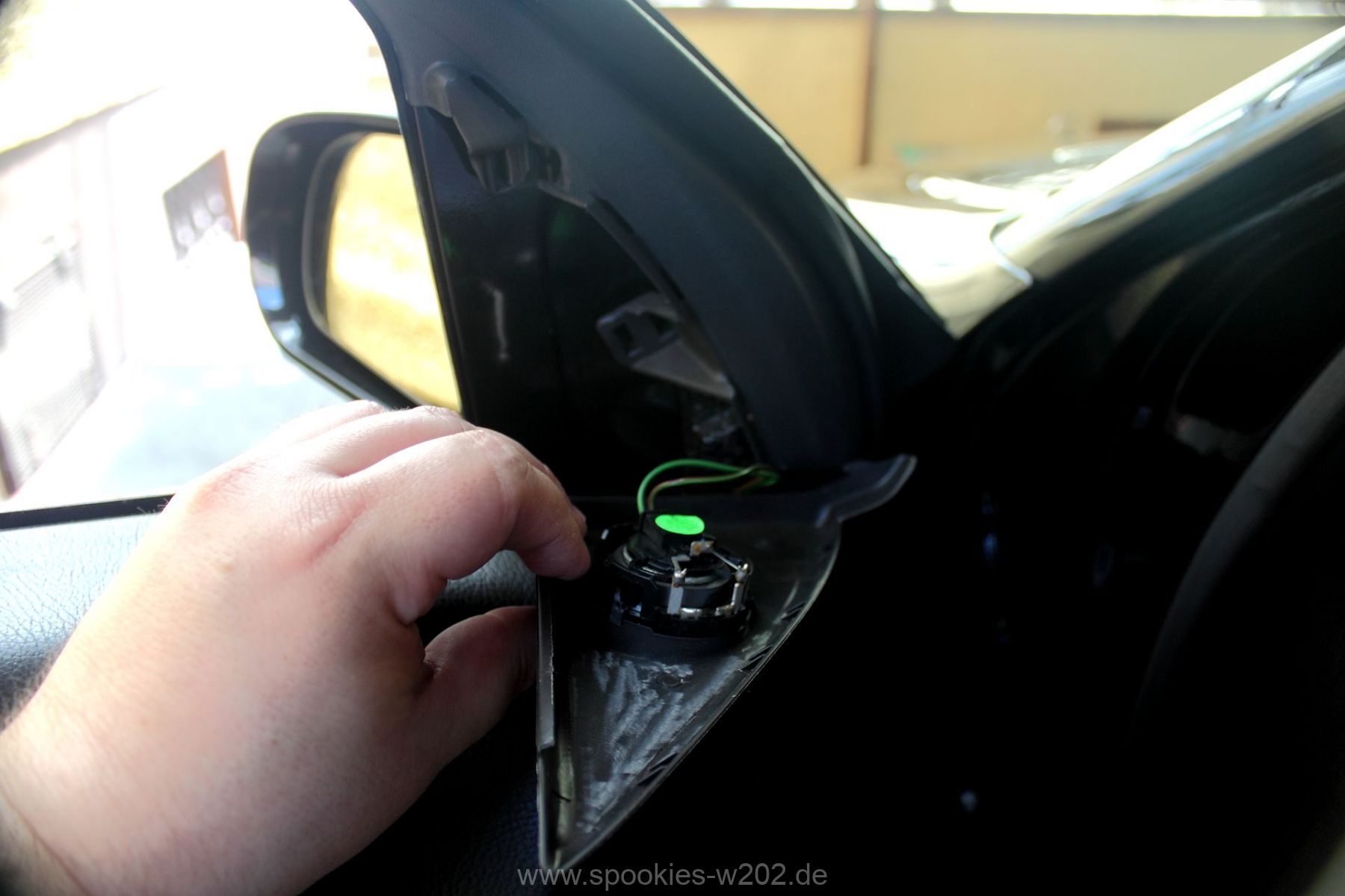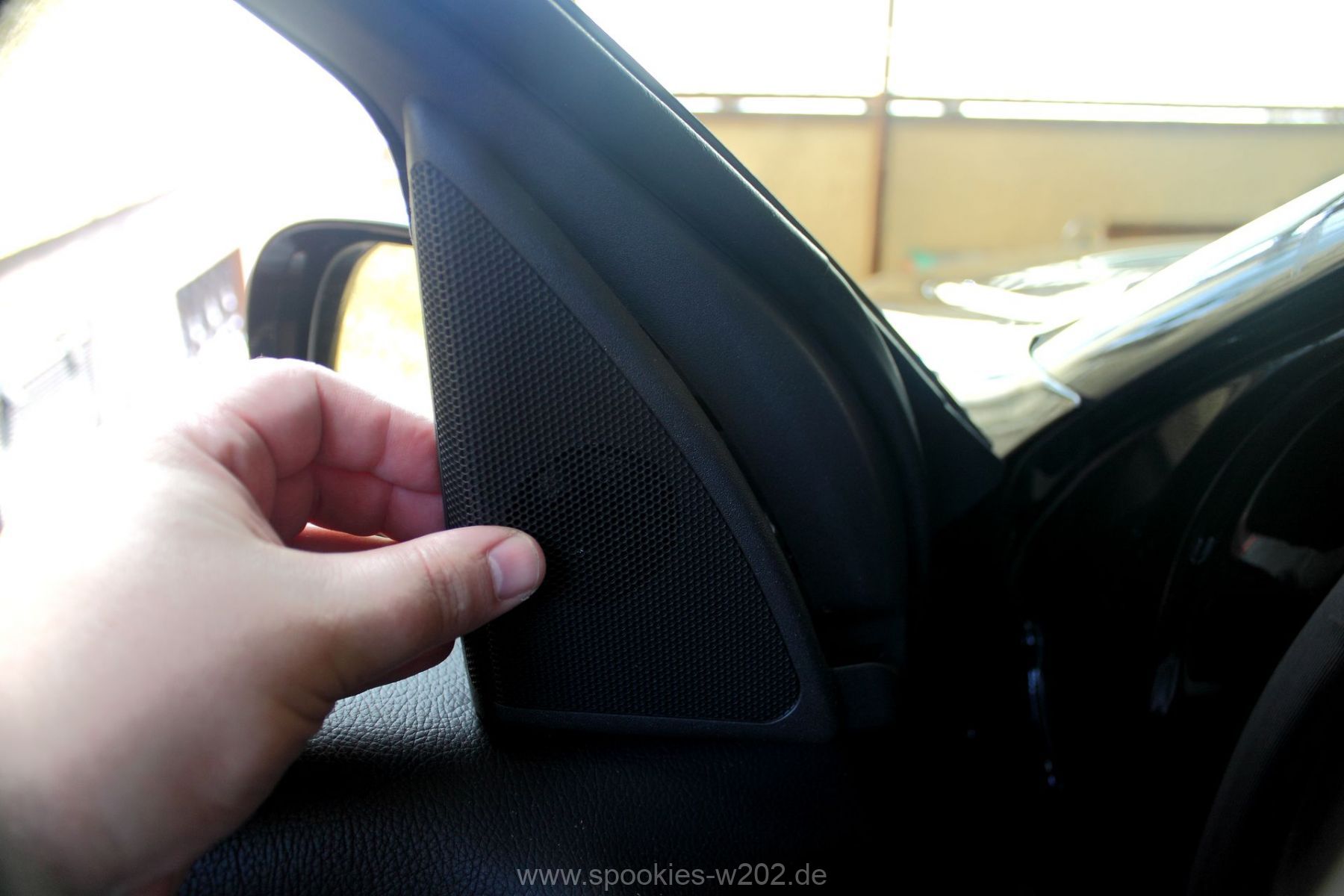 Nun hebeln wir die Dreiecksverkleidung der Hochtäner herunter. Hierzu muss man nur mit einem Kunststoffkeil leicht anhebeln von der Fensterseite her und anschließend einfach abnehmen. Achtet auf das Kabel des Hochtöners.