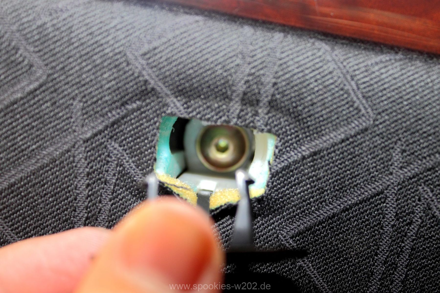 Nun sehen wir die Metallklammern, die die Blenden von hinten festhalten. Diese sitzen sehr stramm, man muss sie aber nicht zerstören. Am besten mit einem kleinen Schlitzschraubendreher die Klammern etwas aufbiegen. Keine Sorge, sie sind sehr stabil. So kann man sie dann etwas drehend abziehen und beiseite legen. Wer faul ist, legt sich vorher einen Satz neue zu und schneidet die alten einfach auf. Eure Entscheidung.