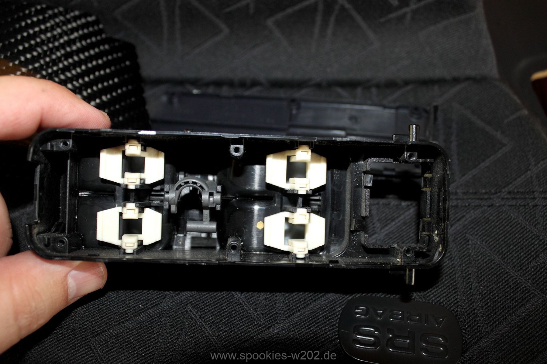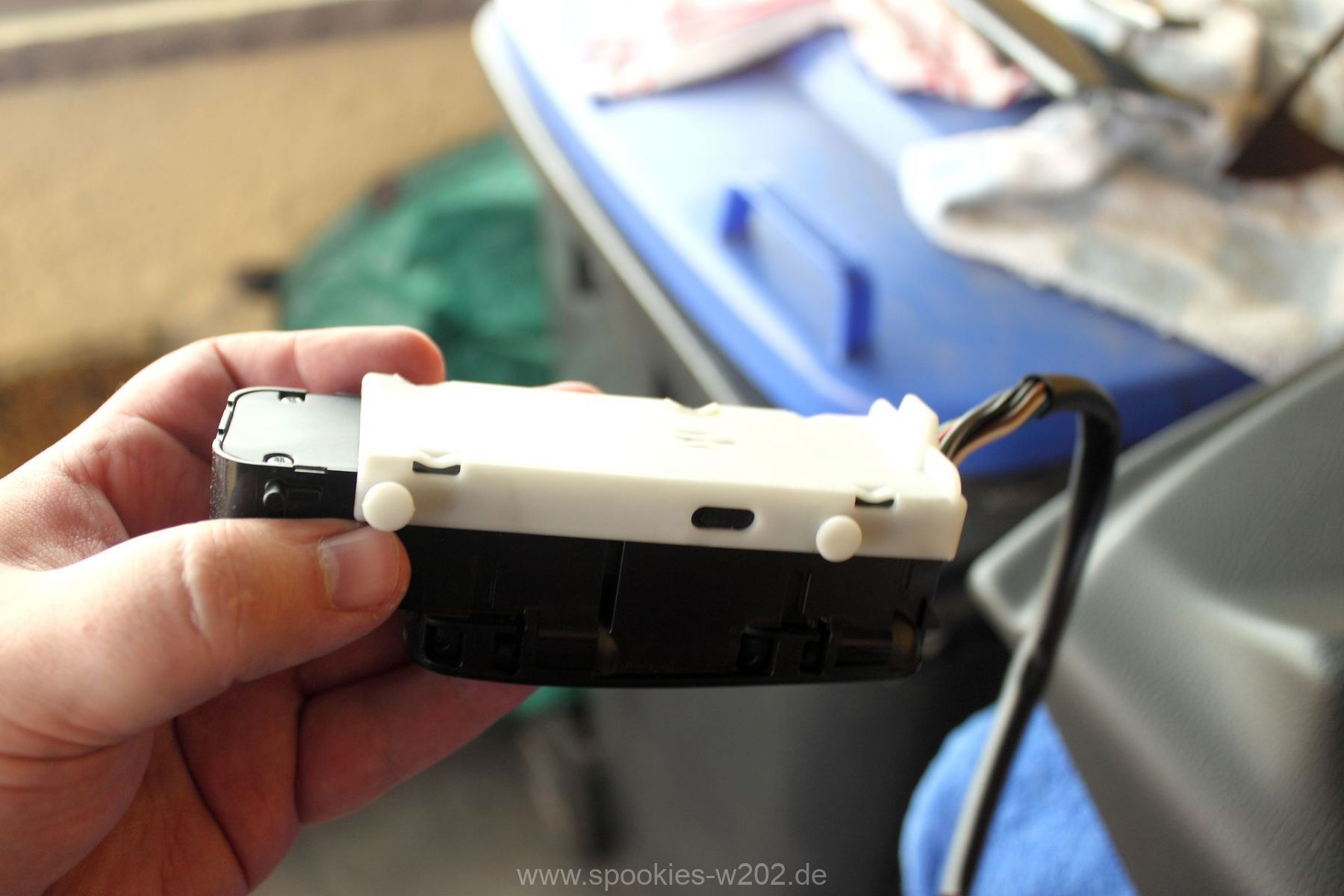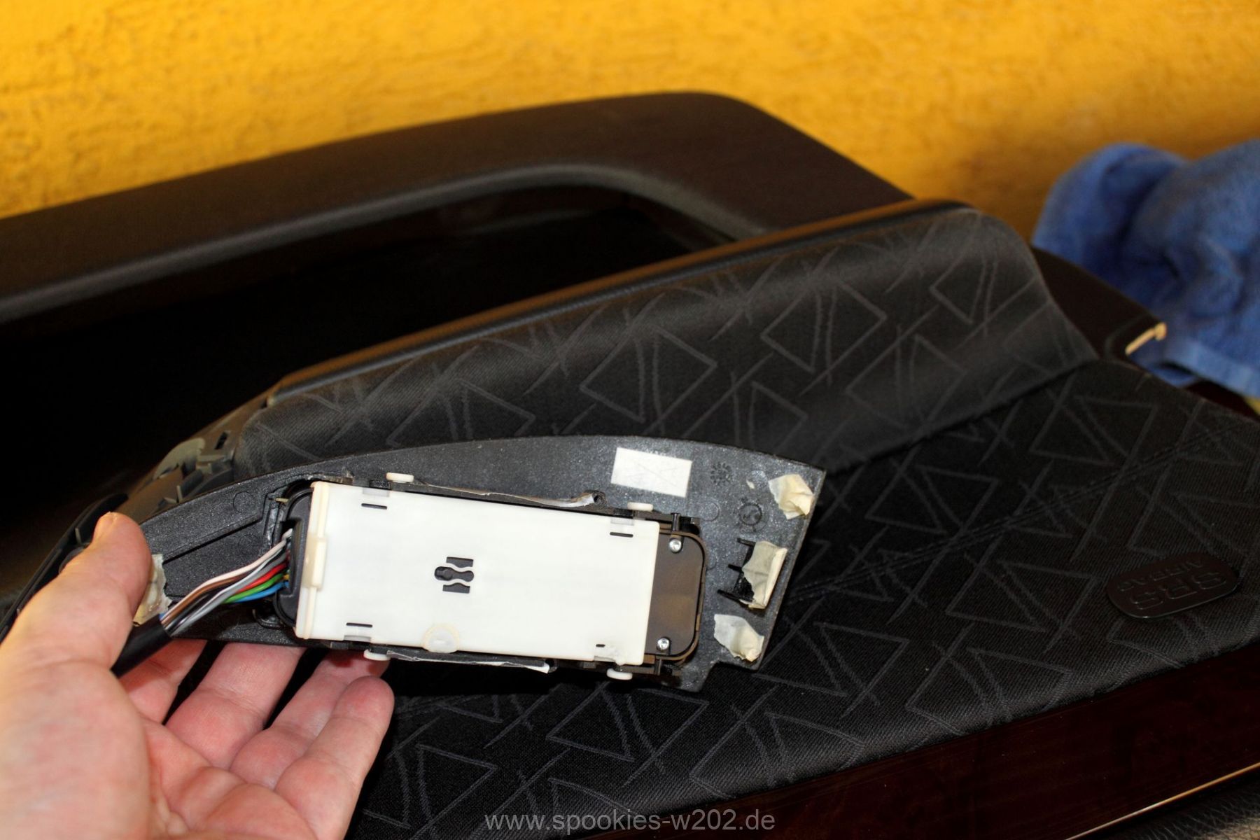 In der Türverkleidung sehen wir den Schalterblock von hinten, diesen muss man nur etwas schieben und kann ihn dann Ausclipsen. Es ist im Grunde selbsterklärend. Anschließend kann der Block abgenommen werden.