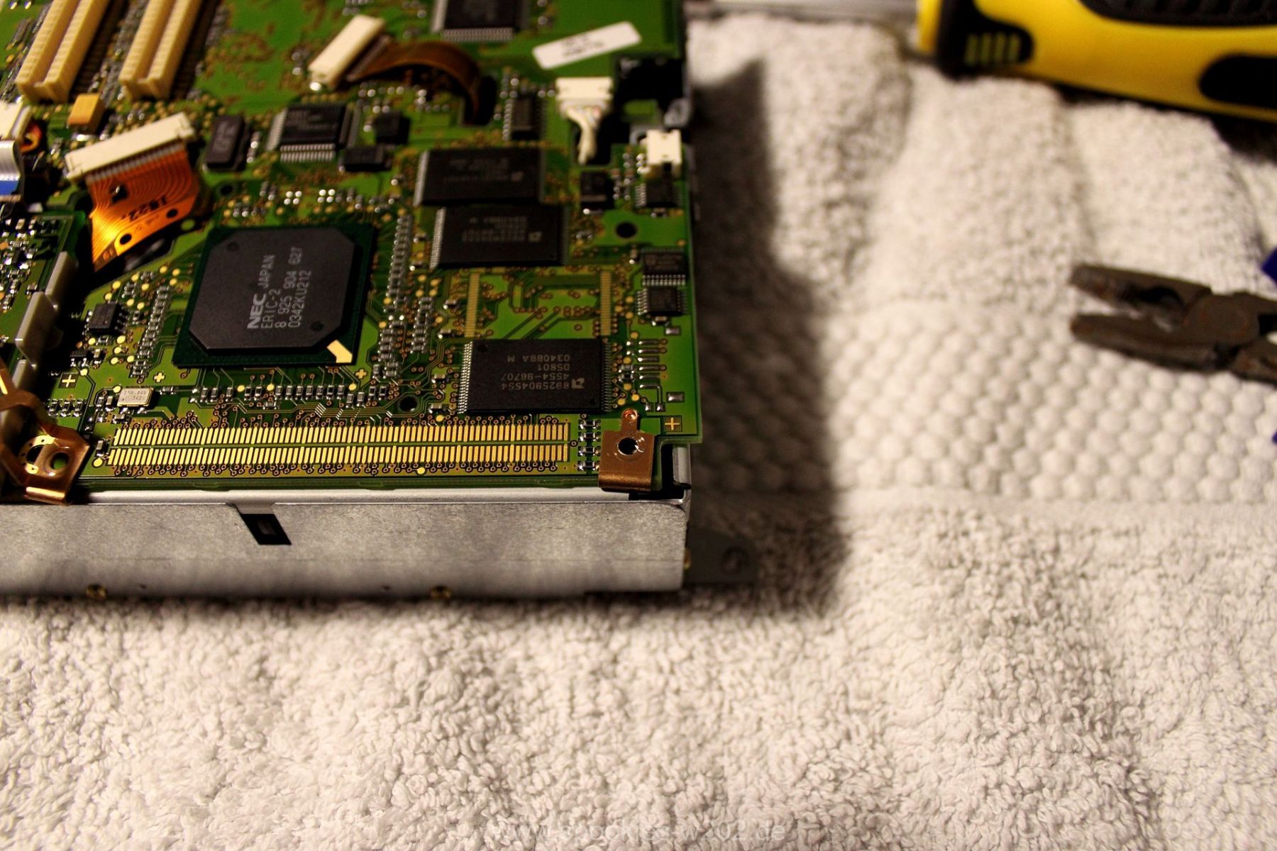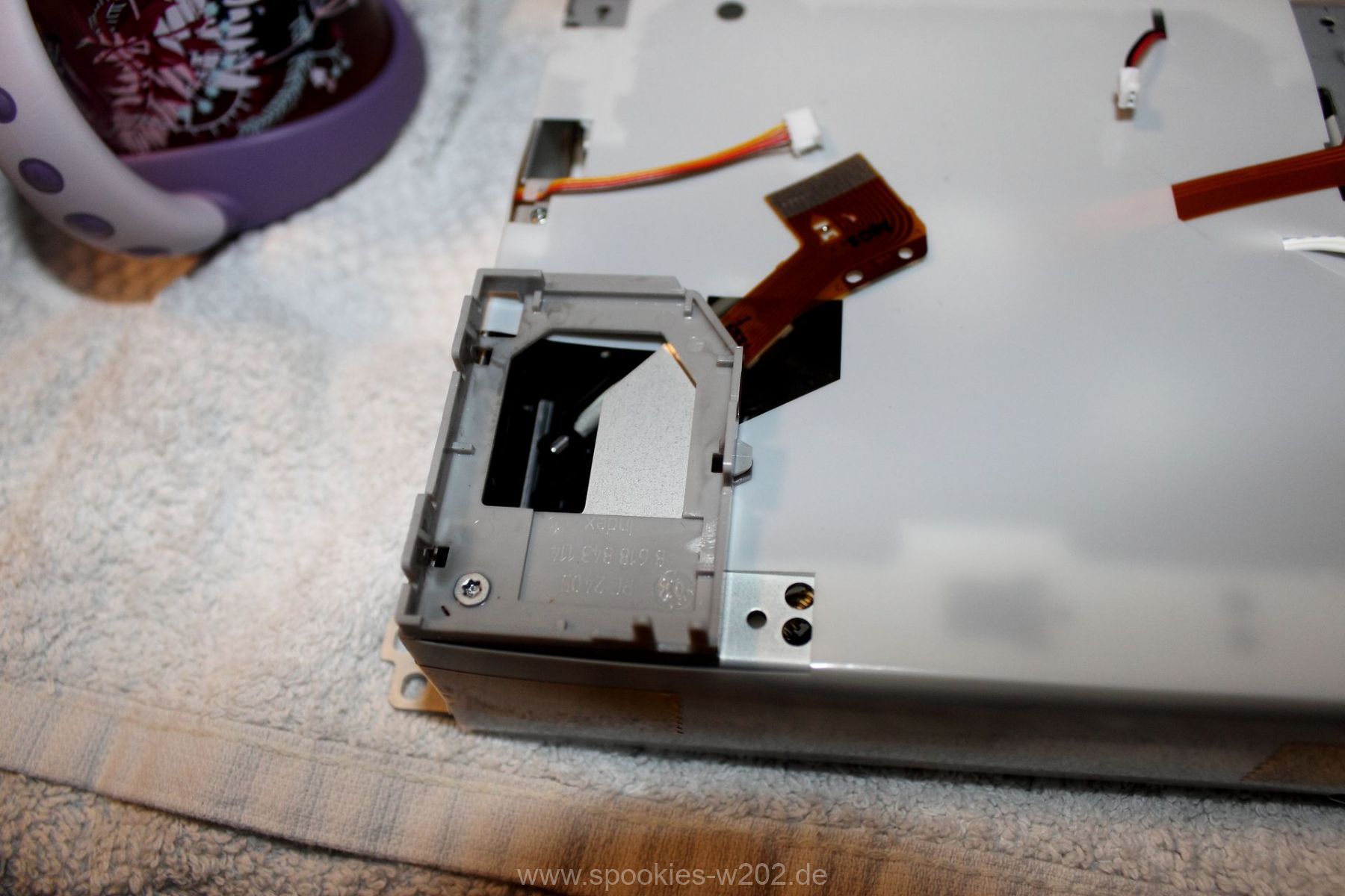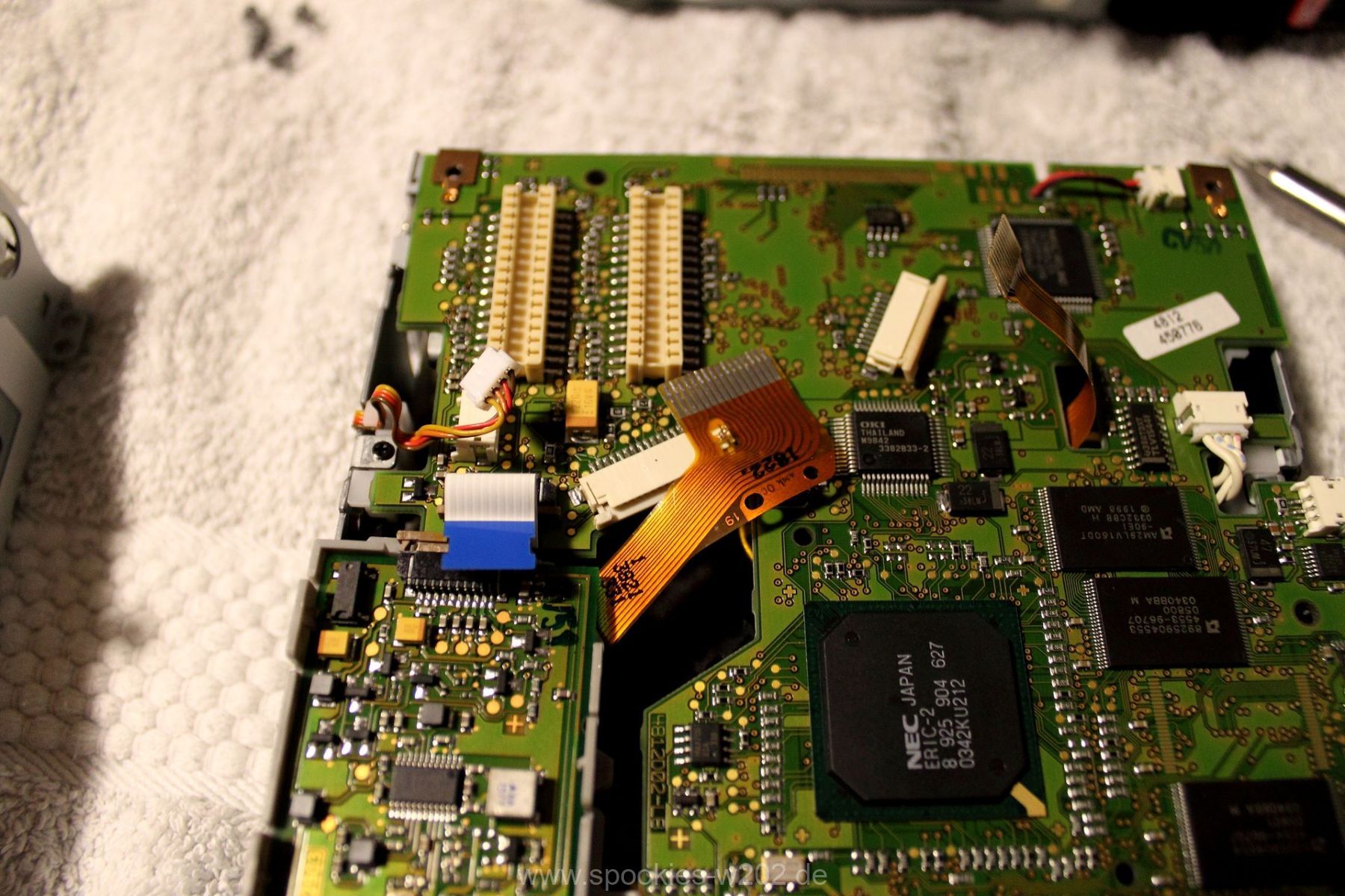 Nun haben wir das ausgebaute Laufwerk vor uns liegen und lösen die Torx Schrauben rundherum, um die Platine vom Lauferk selber lösen zu können. Denkt an die Flachbandkabel.