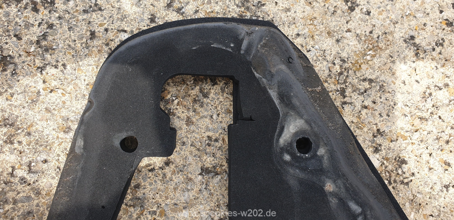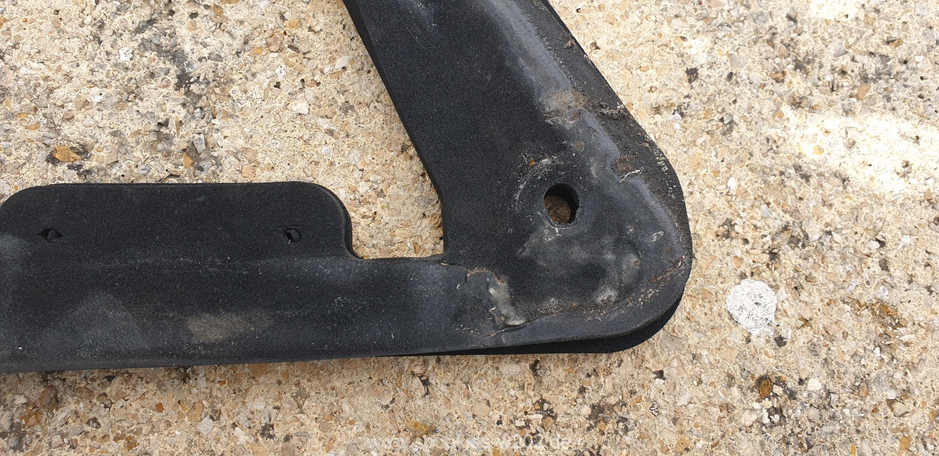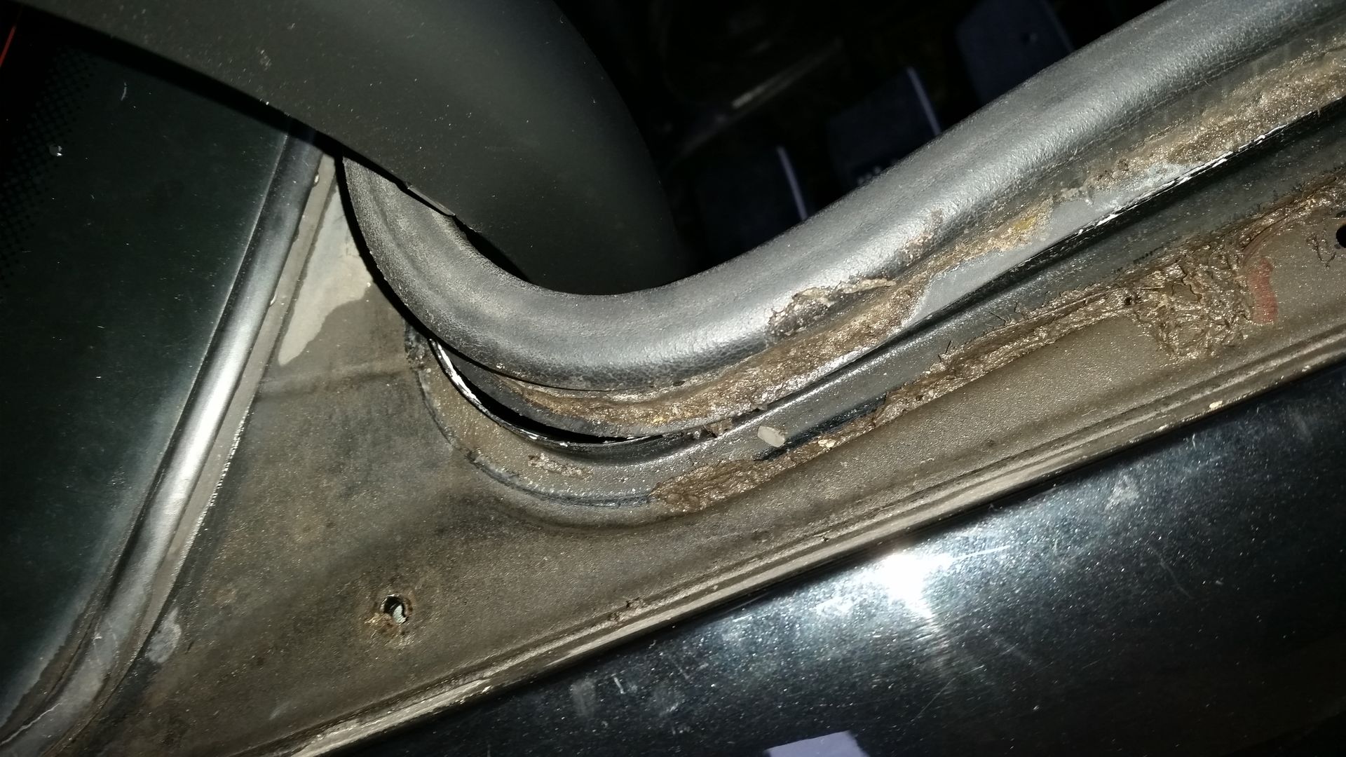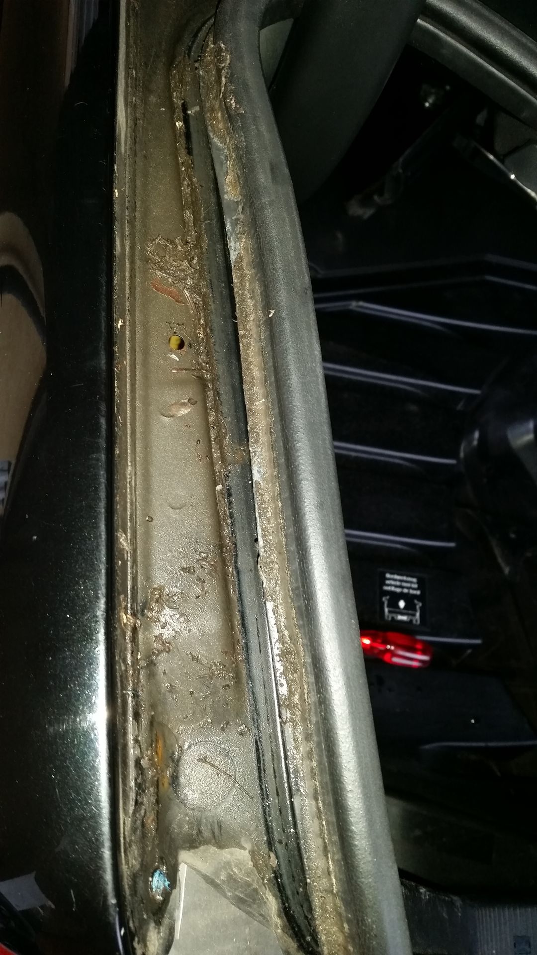 Die einvulkanisierten Gummis werden mit den Jahren brüchig und lassen Wasser durch. Zudem sammelt sich eine Menge Dreck und Schlamm unter den Abdeckungen. Hier bitte alles sauber reingen. - Abdichtschiene Kofferraum rechts